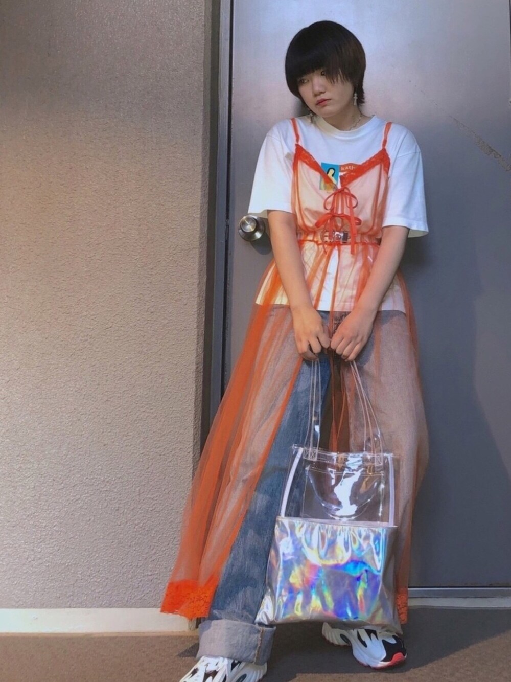 ワンピと小物で女の子らしさ 増し増し🙆♀️🧡 シースルーワンピ可愛いんだけどなあ… 今年でもいける…?大丈夫???🤔💭