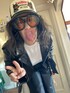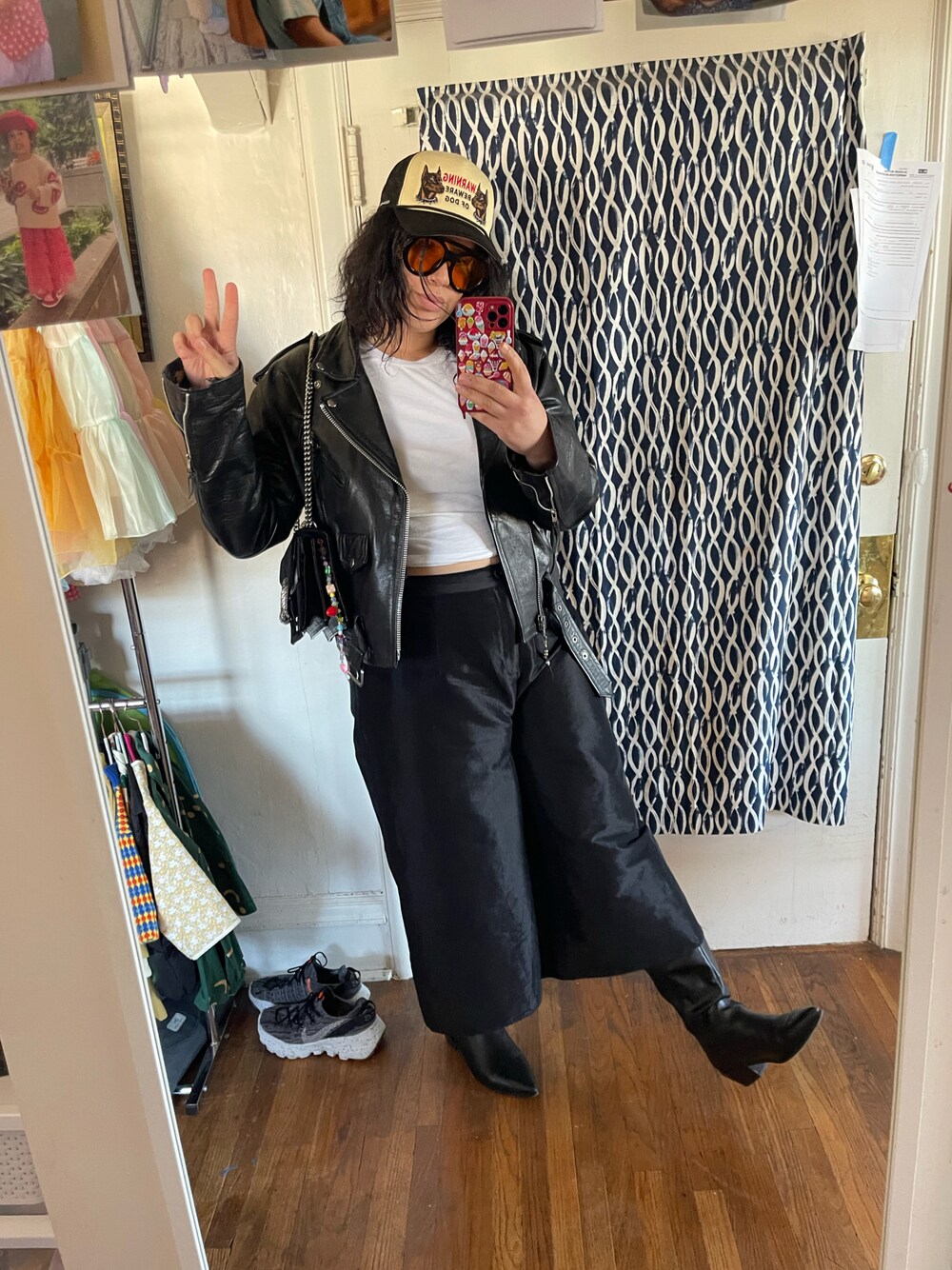 Snap back hat with white crop top vintage leather jacket cropped pants and knee high boots paired with yellow oversize sunglasses and Gucci bag with charms