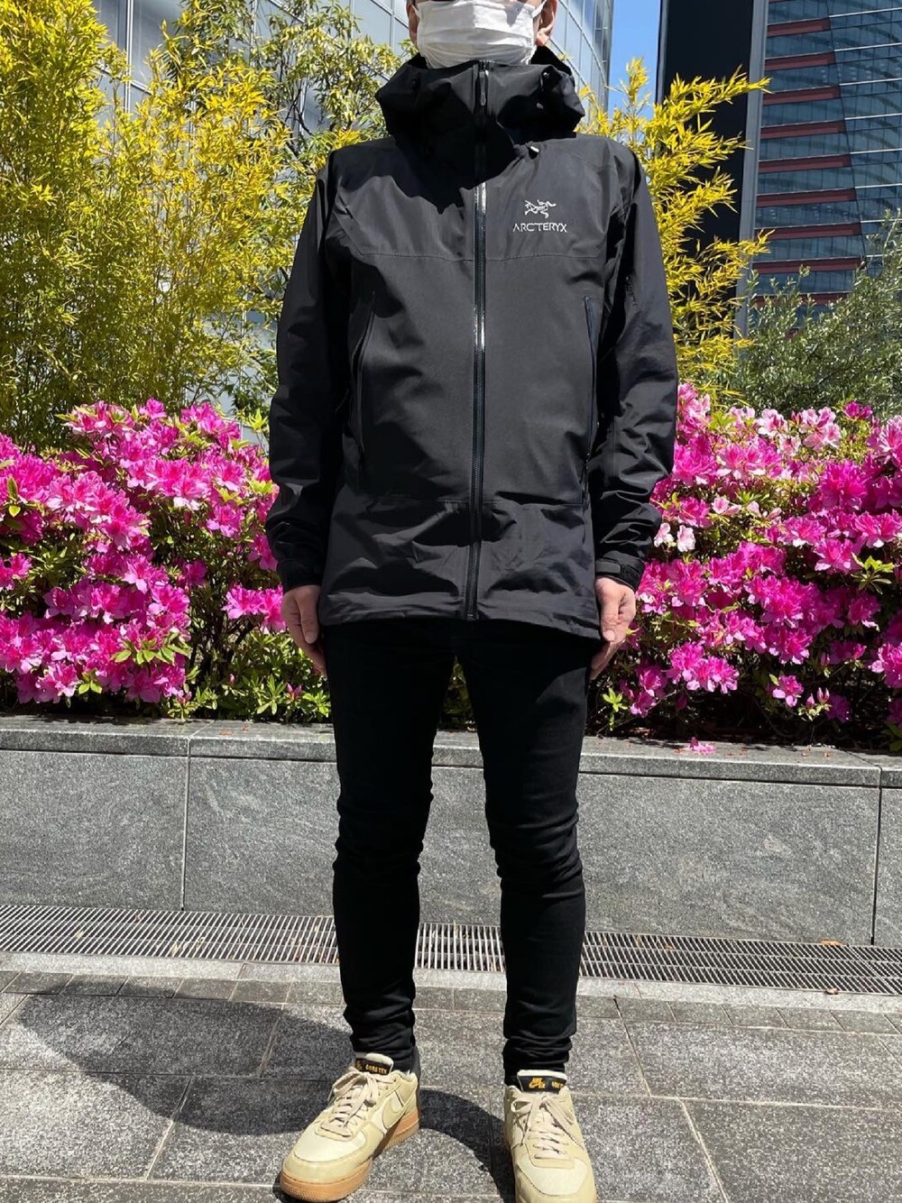 写真では晴れていますが、春の雨の日コーデです! 傘持つのが嫌いなのでアークテリクスのジャケットにGORE-TEXエアフォース1で出勤してます笑 中にはシャツを着ています。