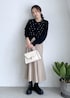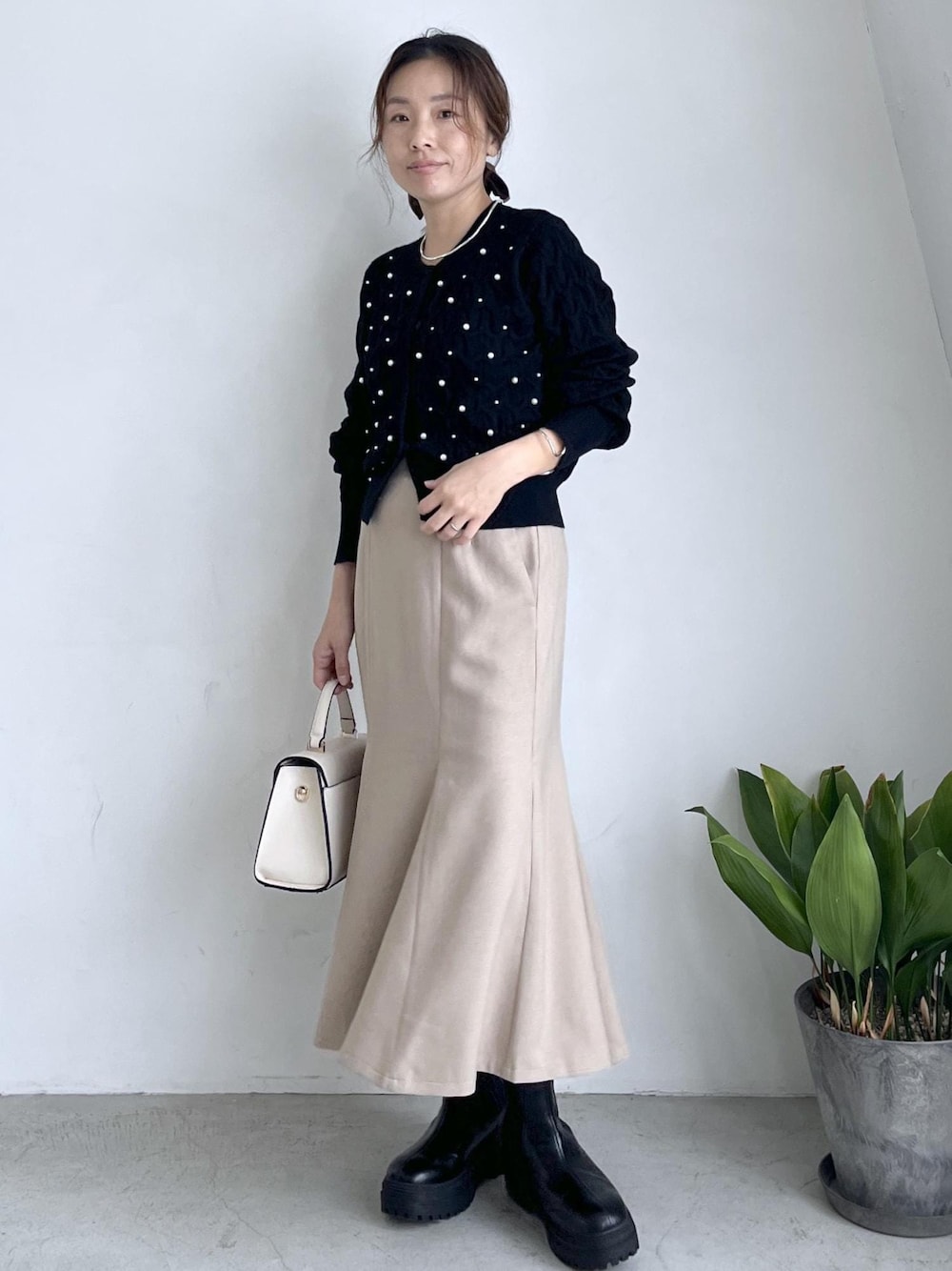 上品なパールがアクセントになったケーブル編みの 黒ニットカーディガンに、ベージュのウーリッシュマーメードスカートを合わせて女性らしいラインを強調。 サイドゴアブーツを黒で揃えて、甘さの中に程よい辛さをプラスしました。 きちんと感もありながら華やかさもある着こなしは、デイリーから特別な日まで活躍します。 10/1(水)〜10(金)まで限定 予約+10%ポイントアップキャンペーン実施中 お得に手に入るこの機会をぜひご利用ください
