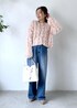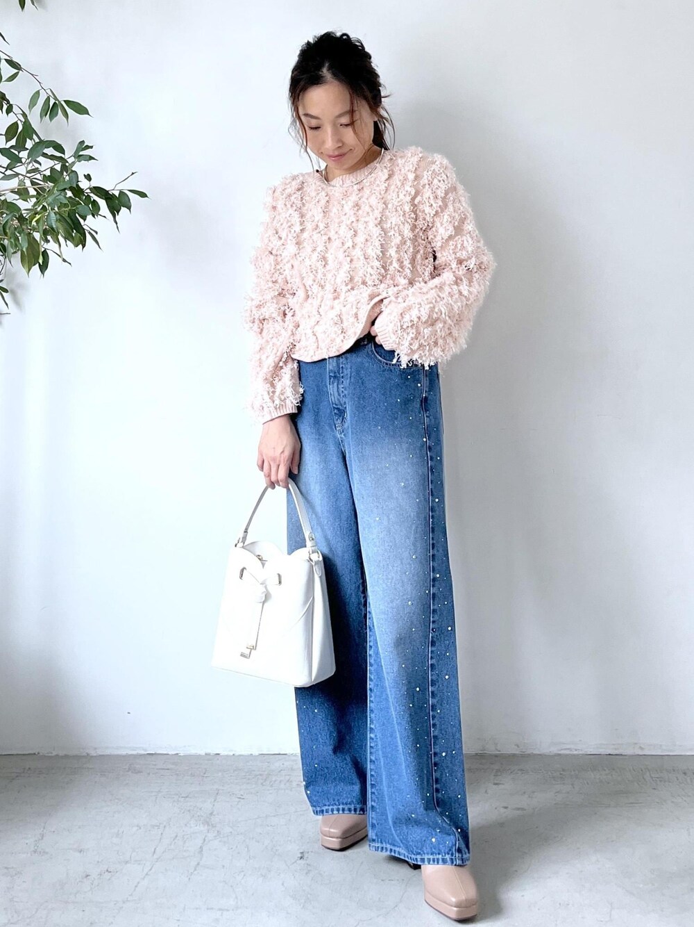 リボンヤーンのフリンジニットをピンクで取り入れ、存在感あるラインストーン付きデニムと合わせた華やかコーデ。 ハートバッグの白が軽やかさを添え、ベージュブーツで柔らかくまとめました。 可愛らしさとデニムのカジュアル感を両立できる、大人のためのフェミニンスタイルです。 10/1(水)〜10/10(金)まで限定 予約で+10%ポイントアップキャンペーン実施中。 この機会にぜひチェックしてください。