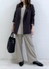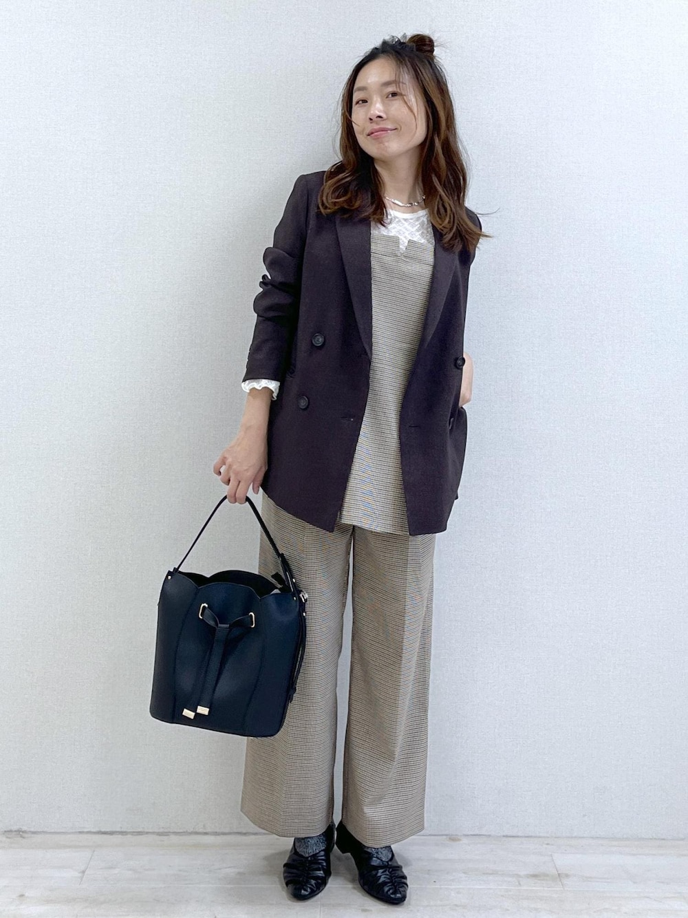 さりげないチェック柄のビスチェとパンツのセットアップは、きちんと感とこなれ感を両立。 レースインナーで甘さを添えて、ジャケットを羽織ればお仕事シーンにも◎ 単品使いもできるから、着回し力も抜群です。 大人っぽく仕上げたい日は、黒バッグ&シューズで全体を引き締めました。