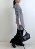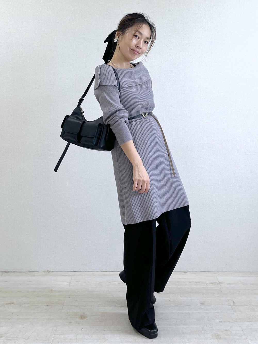 肩のボタンと広めの衿デザインで、シンプルだけど顔まわりに華やかさが出るニットワンピ。 そのまま一枚でも着られるけど、パンツを重ねるとぐっと今っぽく仕上がります! ベルトでウエストマークしてスタイルアップも◎ 黒小物で締めることで、グレーコーデも大人っぽくまとまります