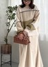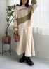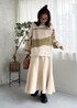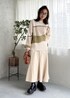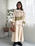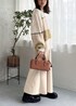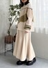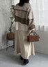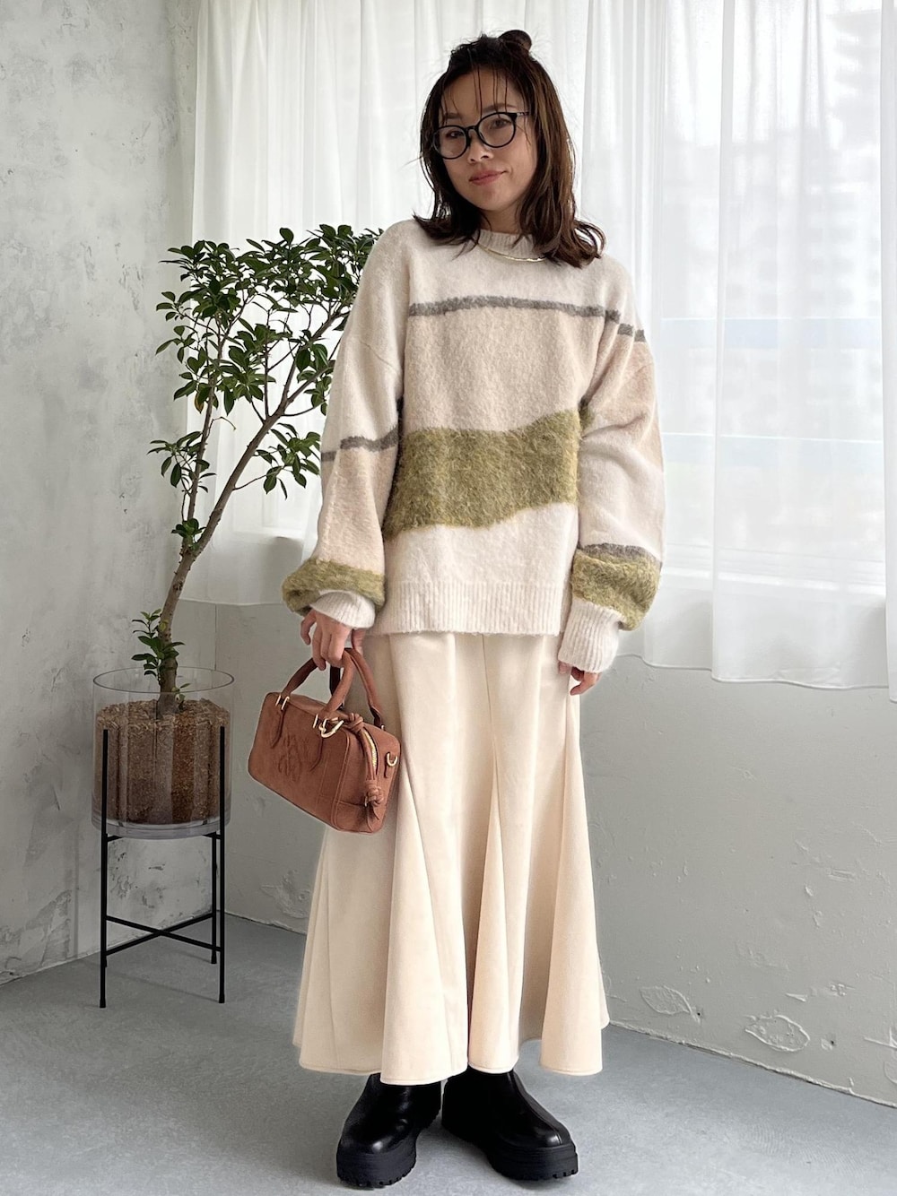 ふんわりグラデーションのオーバーニットを主役に、フェイクスウェードのマーメードスカートで動きをプラス。 トーンを白系でまとめつつ、ブーツの黒とスウェードバッグのブラウンで秋らしい引き締めを。 ほどよいゆるさと上品さが両立する、抜け感ニュアンススタイルです