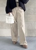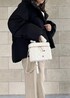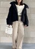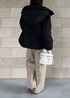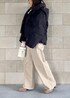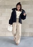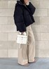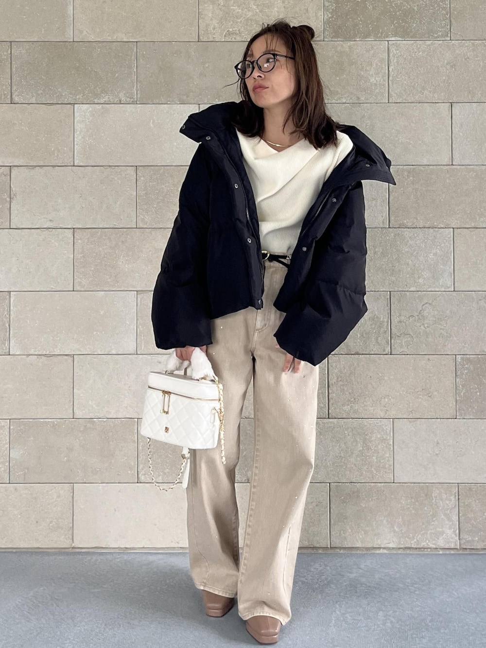 あたたかみのあるベージュデニムに、コンパクトな黒ショートダウンを合わせた大人カジュアル。 インナーのドレープニットとバッグを白でまとめて、冬らしい軽さをプラス ラフだけど品よく見える、休日のお出かけにもぴったりなスタイルです。