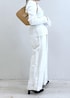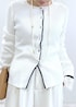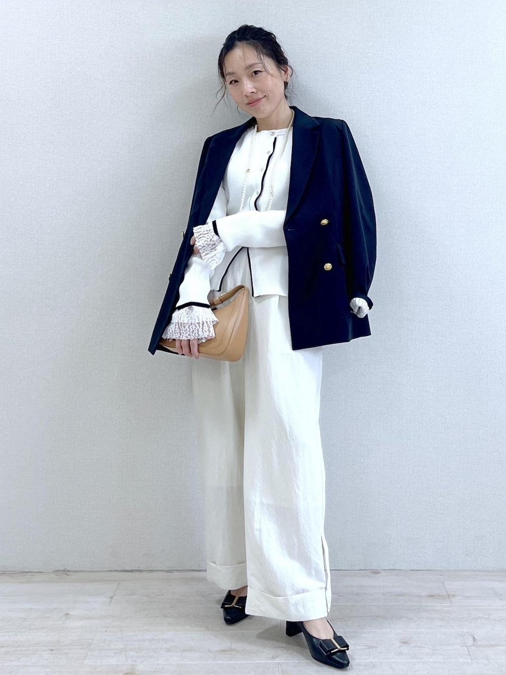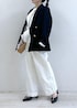 ネイビージャケットで引き締めつつ、 インナーはレース袖でさりげなく甘さをプラス。 オールホワイトでもきちんと見えるのは、 ジャケットと小物でメリハリをつけているから。 お仕事にもお出かけにも使える、大人のきれいめコーデです。