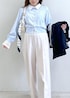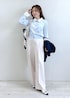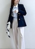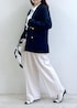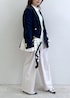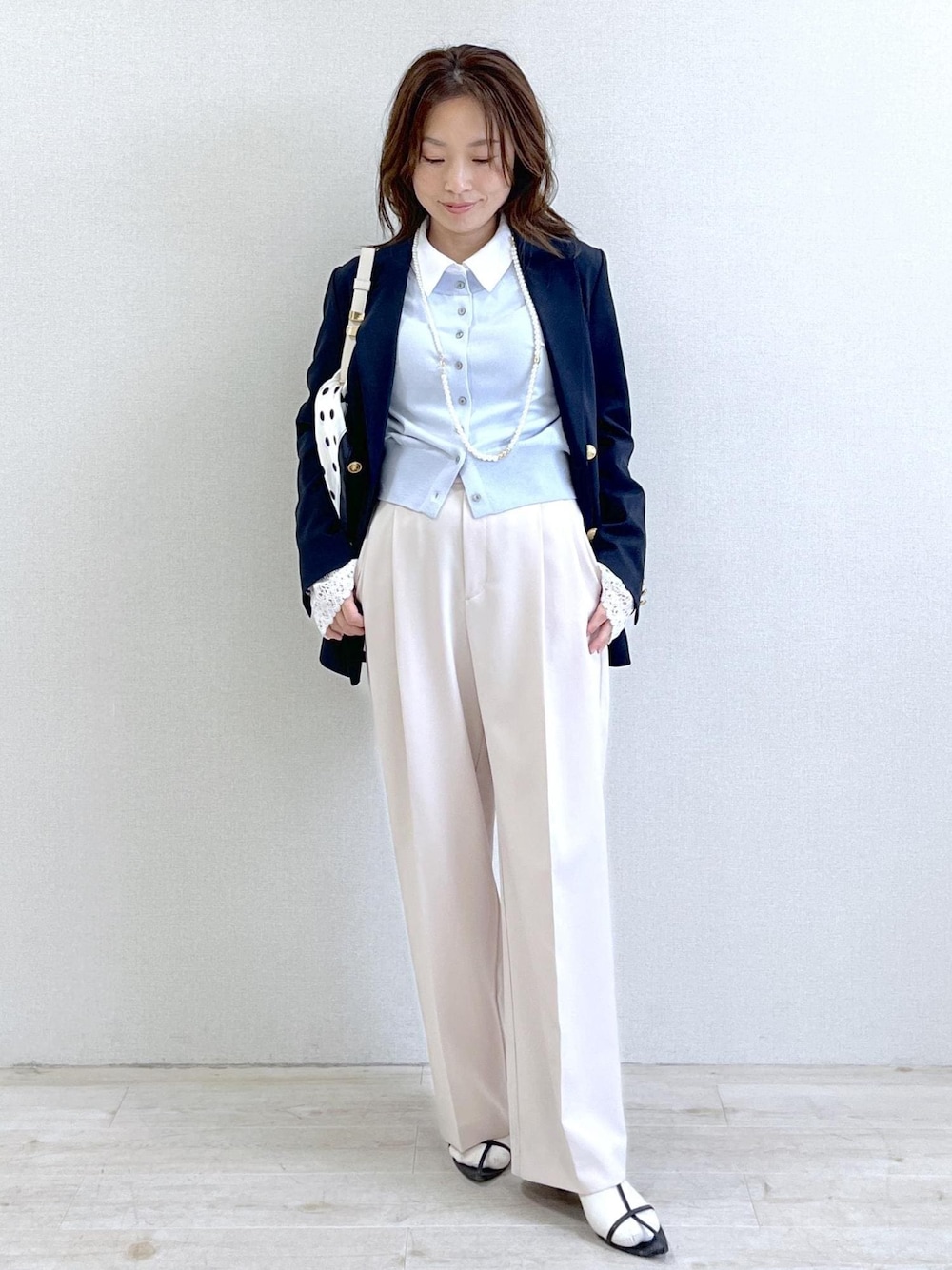 ネイビージャケットに爽やかなサックスカラーを合わせた 上品なきれいめスタイル。 コンパクトなトップスとすっきり見えするワイドパンツで、 スタイルアップも叶うバランスに◎ シンプルながらもパールネックレスやドットスカーフで さりげない華やかさをプラス。 通勤はもちろん、 お出かけや学校行事にもおすすめの好印象コーデです