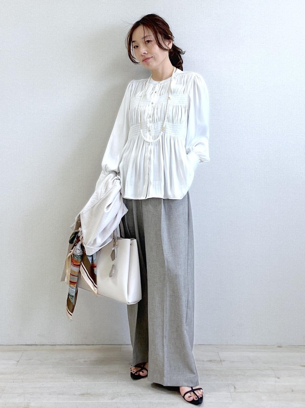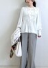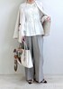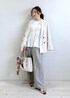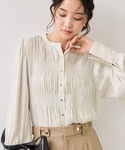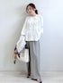 細かいギャザーがポイントのブラウス。 着るだけで華やかな印象になるので、 シンプルなボトムと合わせるだけでコーデが完成します◎ ワイドパンツと合わせて 大人のきれいめカジュアルに。 オンオフどちらにも使える 着回し力の高い1枚です