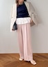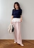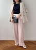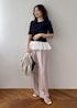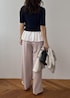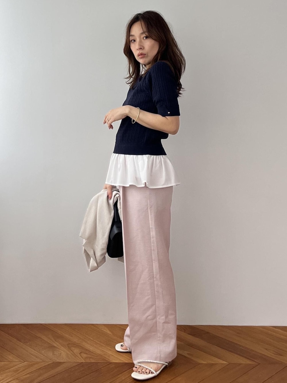 ネイビーニットにフリルブラウスがドッキング 一気にこなれる大人スタイル シンプルなトップスも、 裾のひとクセでぐっと今年っぽい印象に やわらかピンクのパンツを合わせることで、 きちんと感と女性らしさのバランスも絶妙 コンパクトトップス×ワイドパンツで スタイルアップも自然に叶います! 「シンプルだけど普通じゃない」 そんな差がつくコーデを探してる方におすすめです
