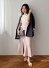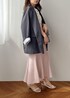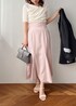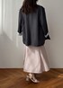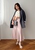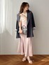 やわらかなピンクスカートに、 ドットトップスを合わせたフェミニンスタイルに ジャケットをさらっと羽織って大人仕様に 甘くなりがちなコーデも、 ダークトーンのジャケットで一気に引き締まるのがポイント◎ マーメイドシルエットで女性らしさを出しつつ、 全体は落ち着いた配色で上品にまとめて 「可愛いだけじゃ終わらせない」そんな大人の フェミニンコーデです
