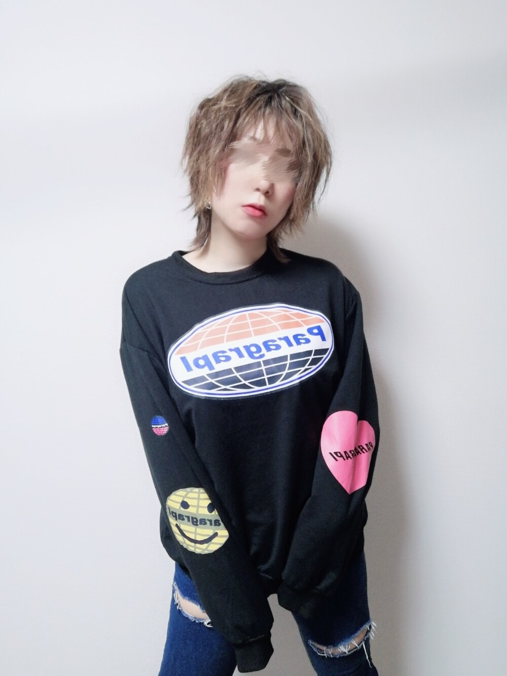 腕プリントが好きなんだよね🤔 ダメージデニムはベスポジ穴を自分で空けた。