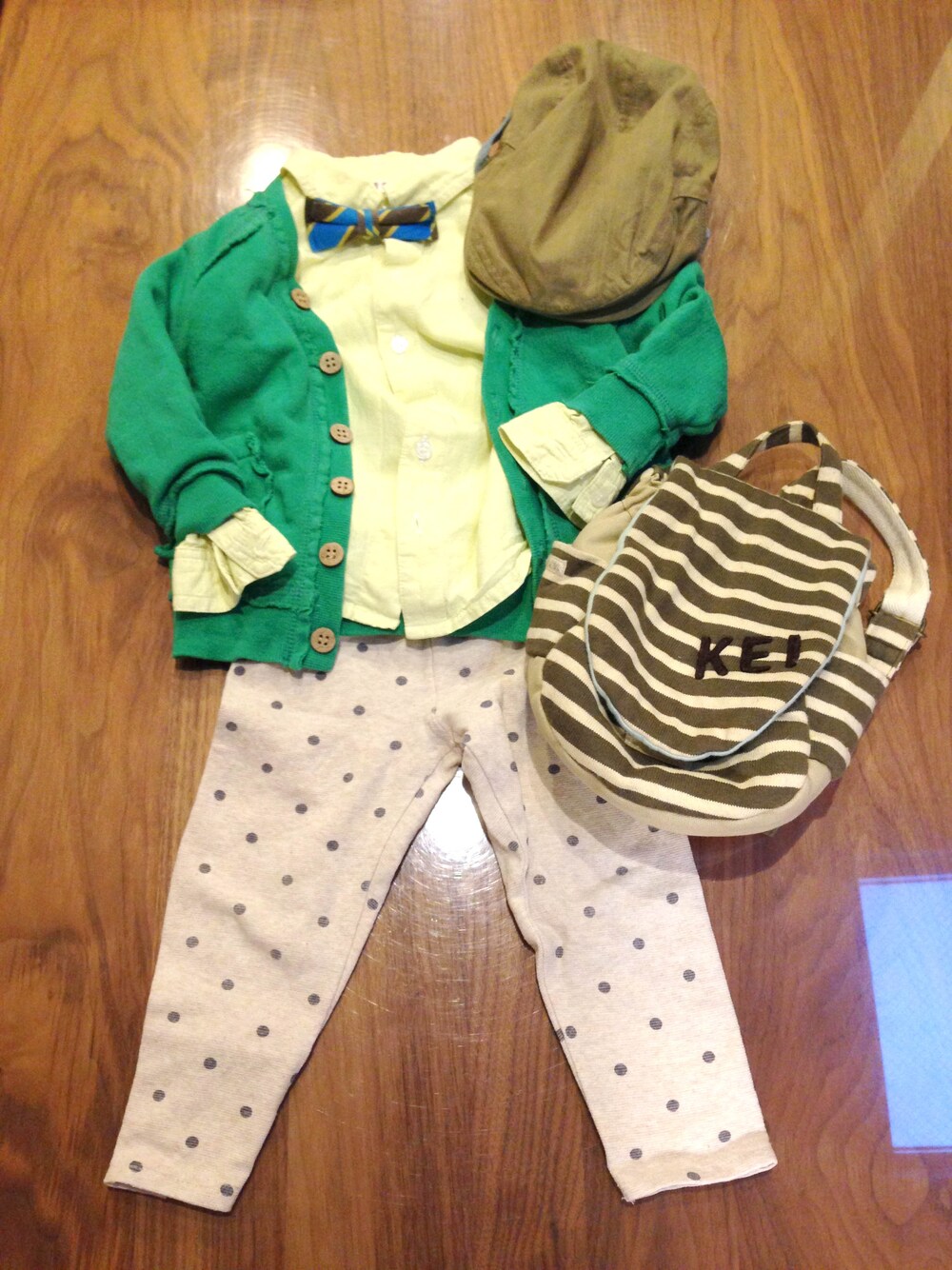 グリーン系のバッグを着用したキッズの春コーディネートの1枚目の写真