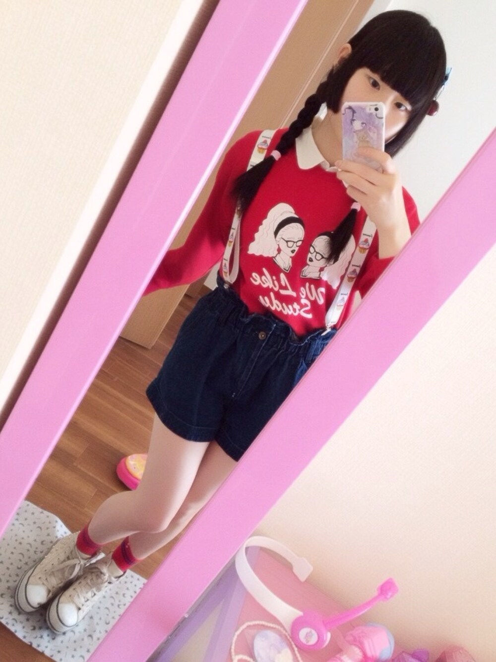 スウェット:WEGO ショートパンツ:nice claup サスペンダー:WEGO あたまにはチェリー🍒💜