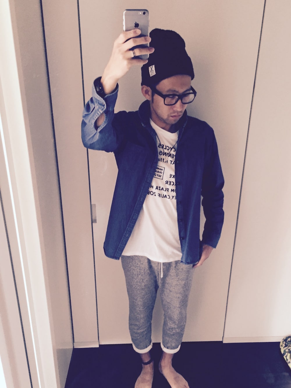 ゆるコーデ✨ 実家で五平餅パーレー✨💕 裸足だけど、足元はニューバランスで👟笑 ほっぺに蜘蛛の巣のタトゥーシール🎃