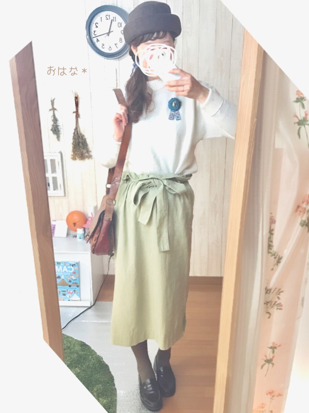 こんばんは🌝🌿 いいね、SAVE、follow ありがとうございます❤️ じつは秋口のコーデです🍂 帽子にタイツと茶色がよき〜🌰 スカートはコーデュロイだけど 春色なので今の時期着回す予定◎