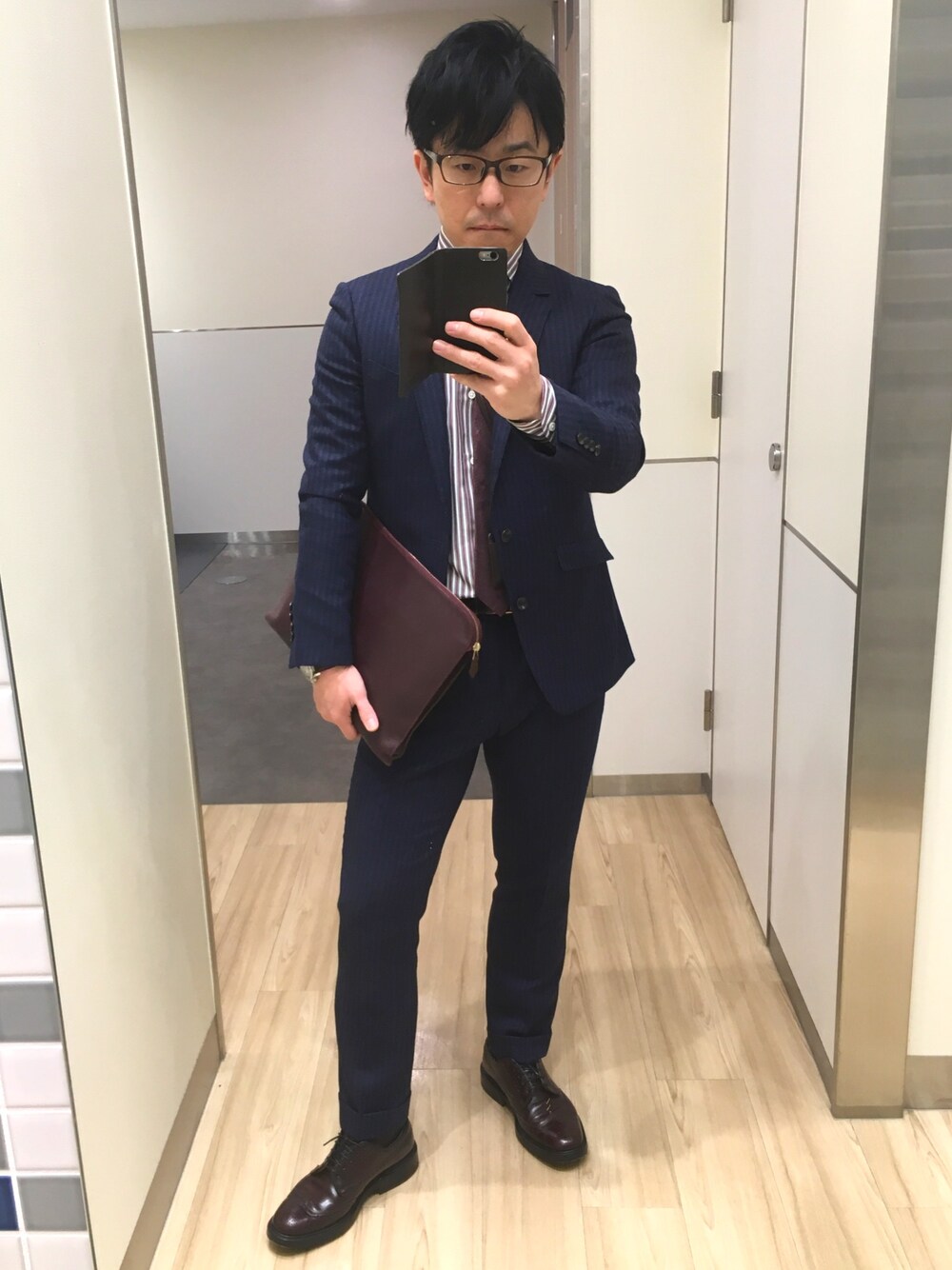 おはようございます😃今日から長崎入りで仕事です!珍しく大雪です😅…なのに…リペアからあがってきたコードバンチャーチ、グラフトンを履いて頑張ってます😉 スーツはエディフィス!薄くボルドーのストライプ入りです😊お気に入りのセットアップです! シセイのクラッチもボルドーで今日はボルドーコーディネートしてます(^○^)😊