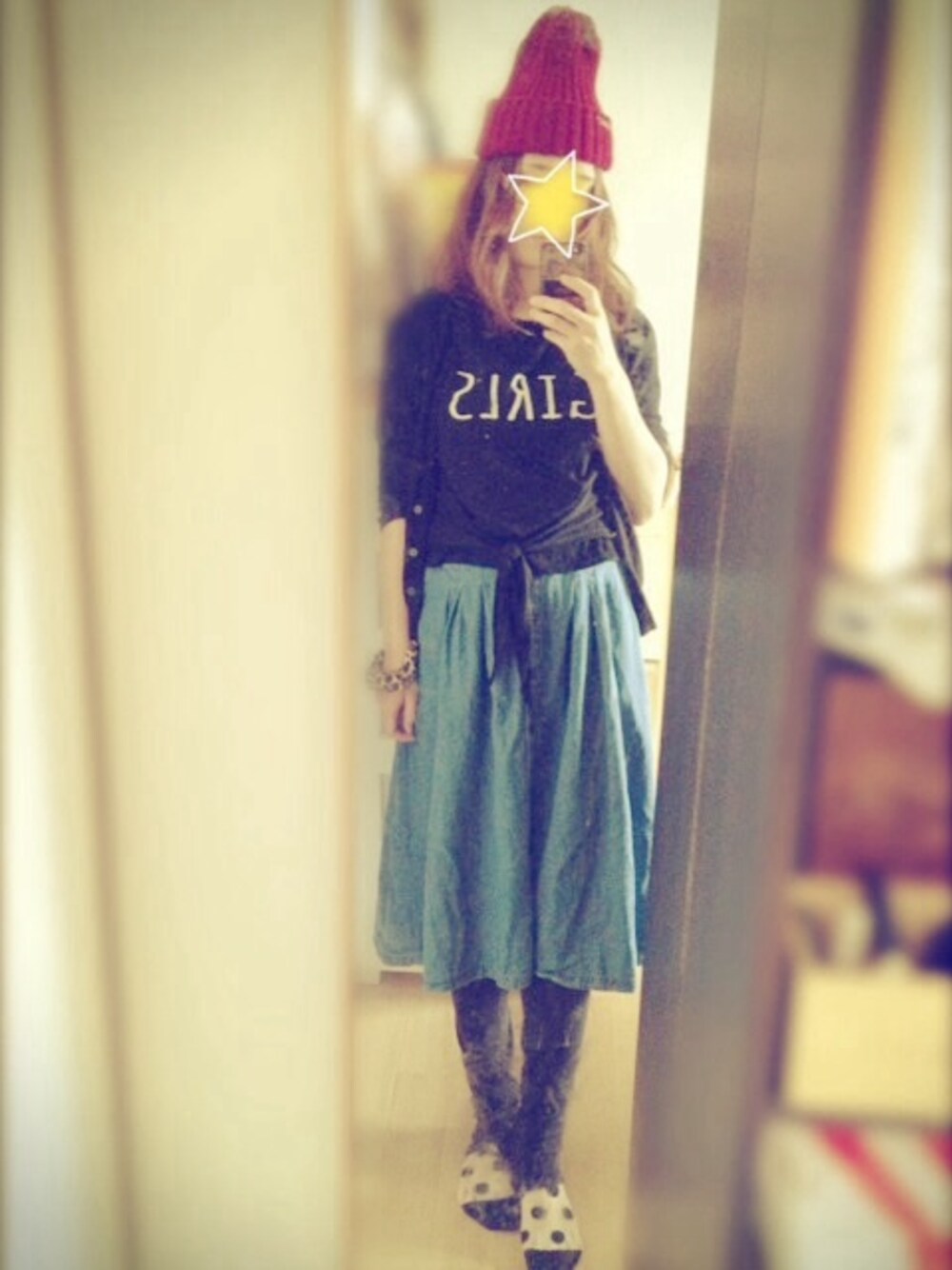 Tシャツ*GRL カーディガン・靴下*GU デニムsk*しまむら ニット帽*DAISO だいぶ前のマタニティコーデです♫