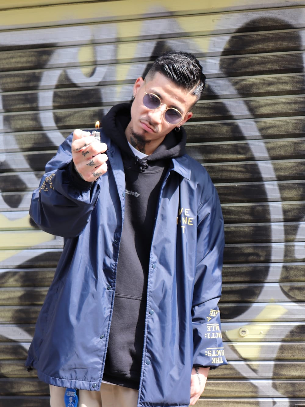 Felipe Fumio Kikutaのナイロンジャケット「COACH JACKET-THE FACTS:-」を使ったコーディネート