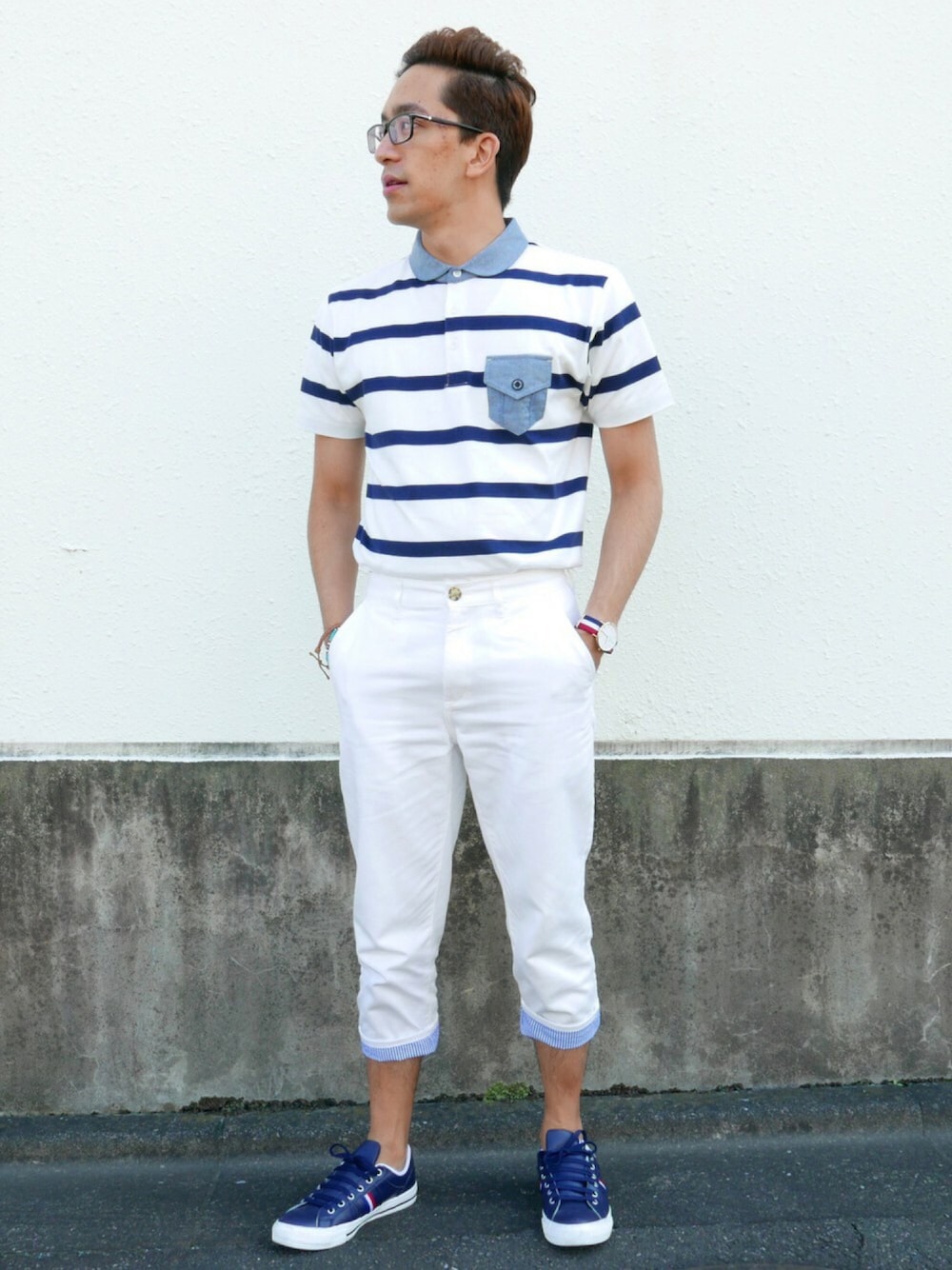 今日のコーデはブルトン(Breton)にしました。 ネックの色とTポケットは面白いので買いました。😅🛍 実は本当のポロじゃないけどデザインが似てる。👕 下はGUサマーコレクションの白チノクロップパンツです。やっぱりクロップパンツより半ズボンが好きだね… パレットはシンプル: ネイビーストラップ・白・ネイビー。 オススメ: Weekend, Day time 🏖 Top: Polo stripes by Graniph Watch: St Mawes by Daniel Wellington Bottom: Cropped pants by GU Shoes: Fox by Converse