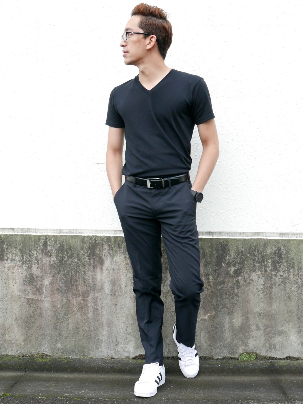 最近ずっと白い服を聞いていたから今日のコーデは黒いにしました。♣️ 上は黒いTシャツと下にドライストレッチパンツにしました。真っ黒なので体の上と下をちゃんと見せるためにレザーベルトをしました。 靴は白いスーパースター。ビジネスシューズてもいいでもフォーマルよりカジュアルな感じをしてみたかった。 オススメ: Weekends 🍻🍔 Top: T-shirt V-Neck by Uniqlo Belt: Leather black by Armandthiery Watch: Black leather by MVMT Bottom: Dry Strech Pants by Uniqlo Shoes: Superstar by Adidas