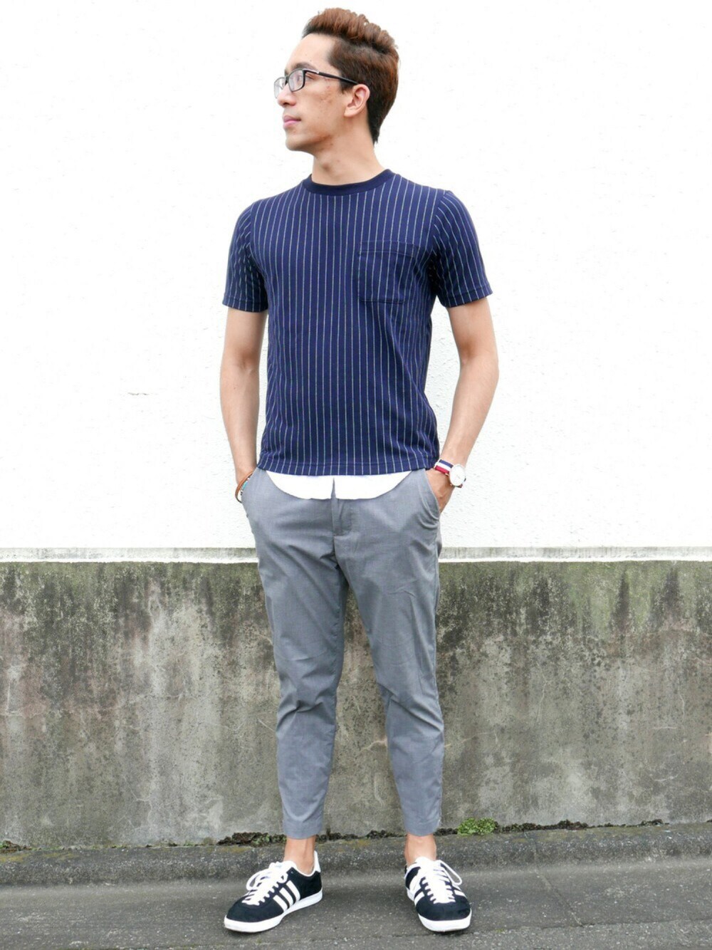 週末は友達と会ったり、買い物したり食事を食べに行ったり期間なので今日はカジュアルとリラックスな服装にしました。👬🍴🛍☁️ このTシャツは面白い。下は偽物のシャツ。外から見るとわからないでしょう。😇 下はグレークロップドパンツ、足首を見せる。もっと高く見えるかなぁ。⤴️ 靴はアディダスのガゼルです。カジュアルスタイルならスニーカーです。👟 ドレッシーしたい場合はブローグはおすすめです。👞 カラーパレット:ネイビー・グレイ・黒。🎨 オススメ: Weekend. 🎮🏓🎬 Top: Stripes Crew Neck T-shirt by Golbal Work Watch: St. Mawes by Daniel Wellington Bottom: Cropped pants by Rageblue Shoes: Gazelle by Adidas