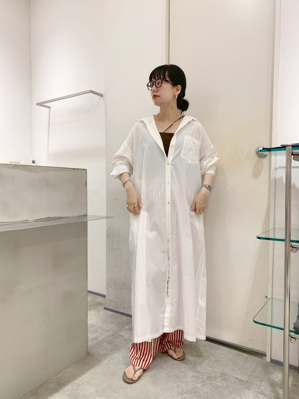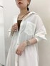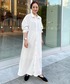 ベーシックに使えるオフホワイトのシャツワンピース。 36を着ています! 赤のストライプパンツで遊びの効いた リラクシングスタイルでコーディネートしました。 ワンピースの素材は綿100%で 洗いをかけた加工を施しているので 柔らかく、くたっとした風合いがあります。 麻のドライな質感と異なり ソフトでvintageのような雰囲気が素敵ですよ!