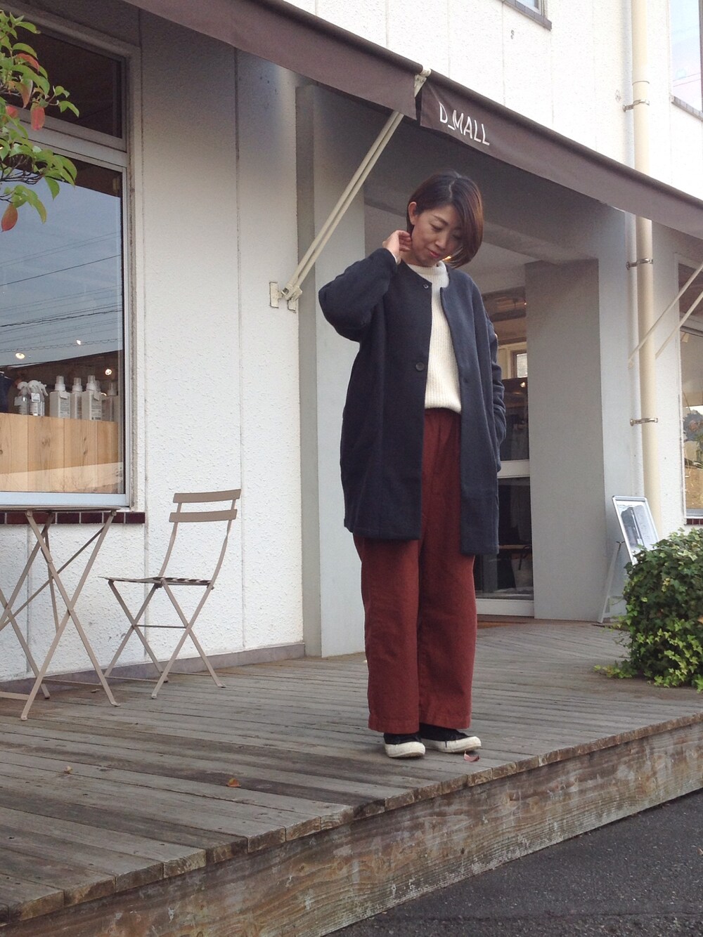 軽くて暖かいウール混のコートは朝晩の寒い時にも使いやすくて便利です。 ワイドパンツとゆったりとしたコーディネートにしました。