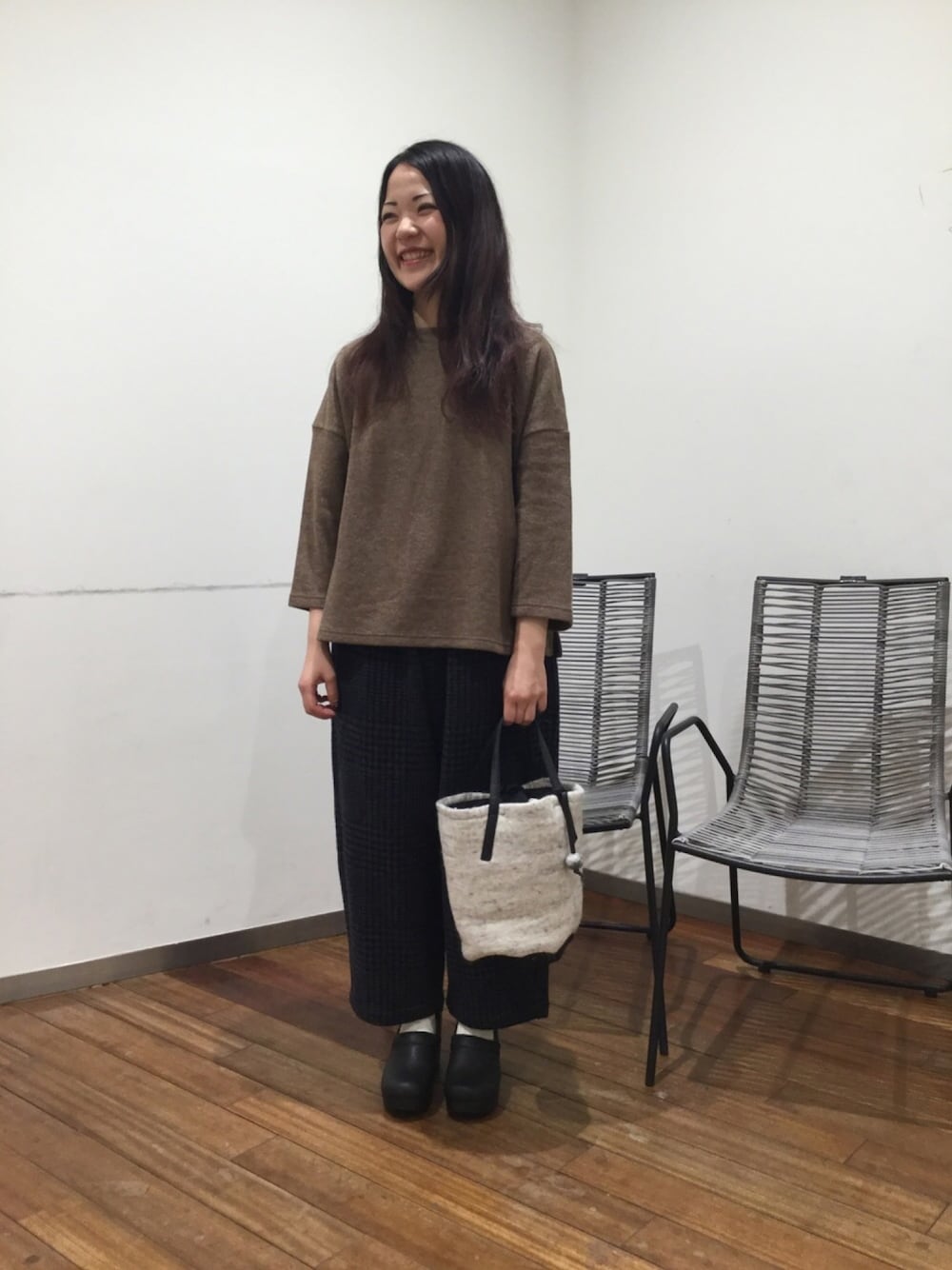 シンプルなニットにはボリューム感のかわいいコクーンシルエットのウールのパンツがバツグンのバランス感。フェルトのバッグが温かみをプラスしてくれます。