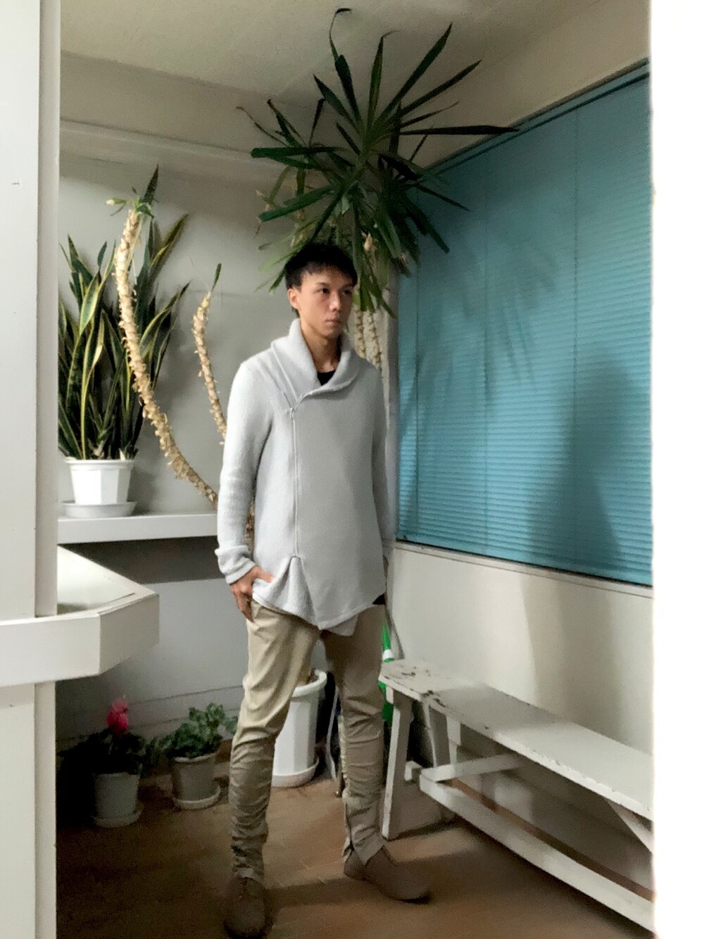 ホワイト系のニット/セーター、ベージュ系のパンツ、ベージュ系のドレスシューズを着用したメンズの冬コーディネートの1枚目の写真