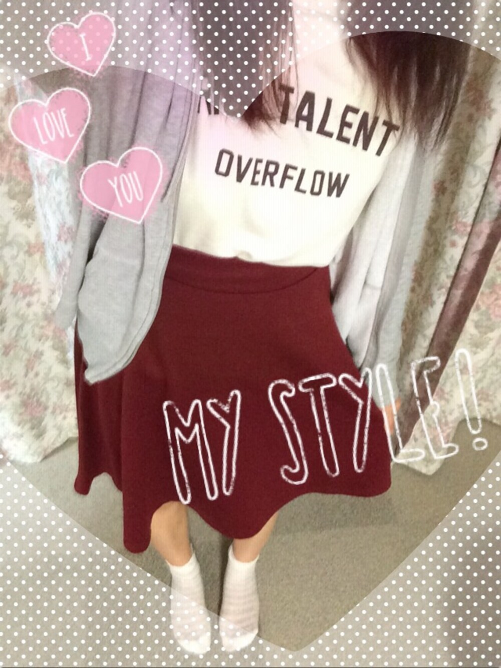 膝ちょい上丈のワインレッド色スカート 膝下だとふくらはぎのせいで太く見える ミニスカだと太ももが太い と母に言われこの丈です。← ワンピの丈はいつもミニスカ丈やのに← 靴下が夏用のまんまヽ(;▽;)ノ