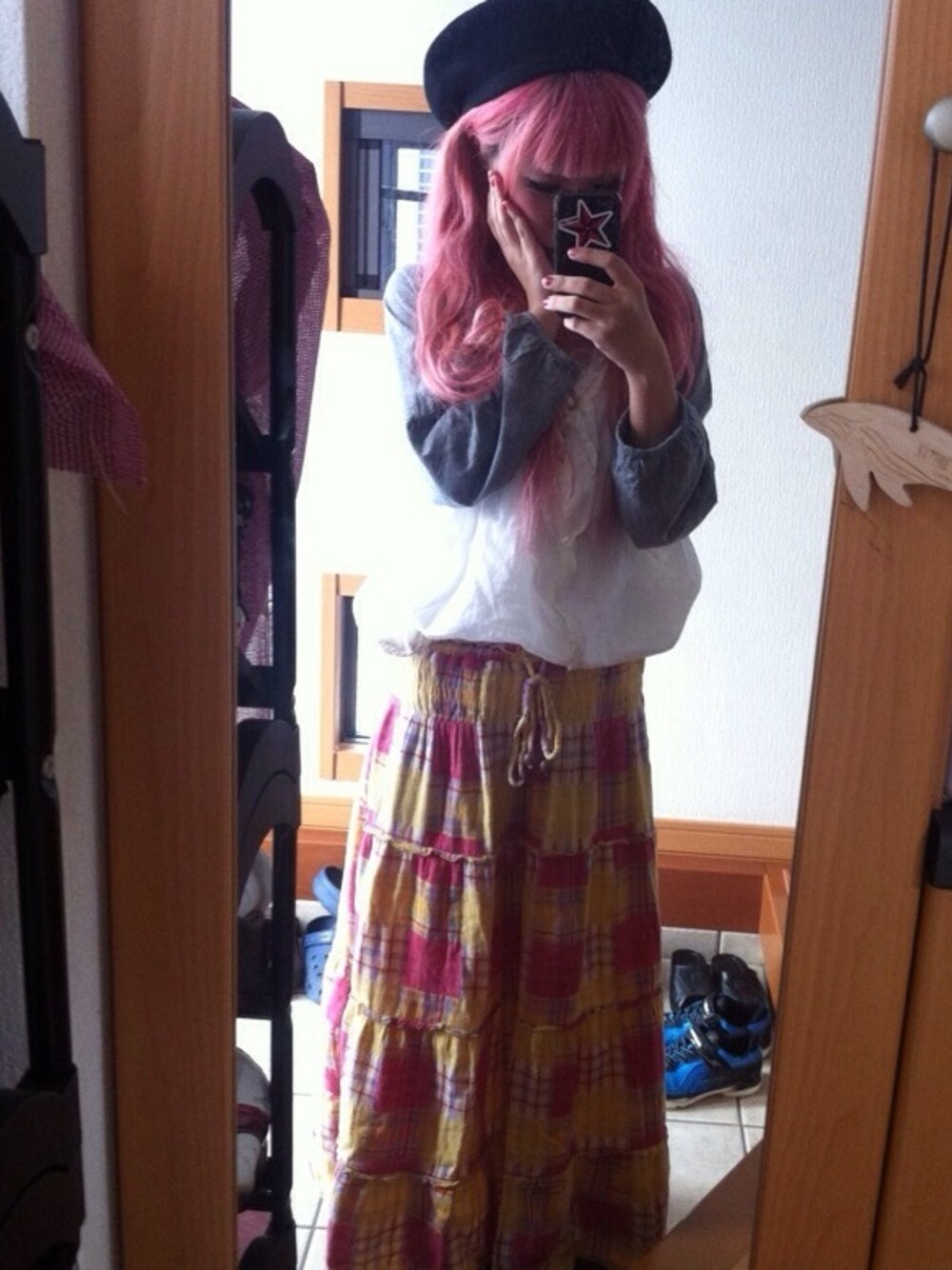 イエロー系のスカートを着用したレディースの春コーディネートの1枚目の写真