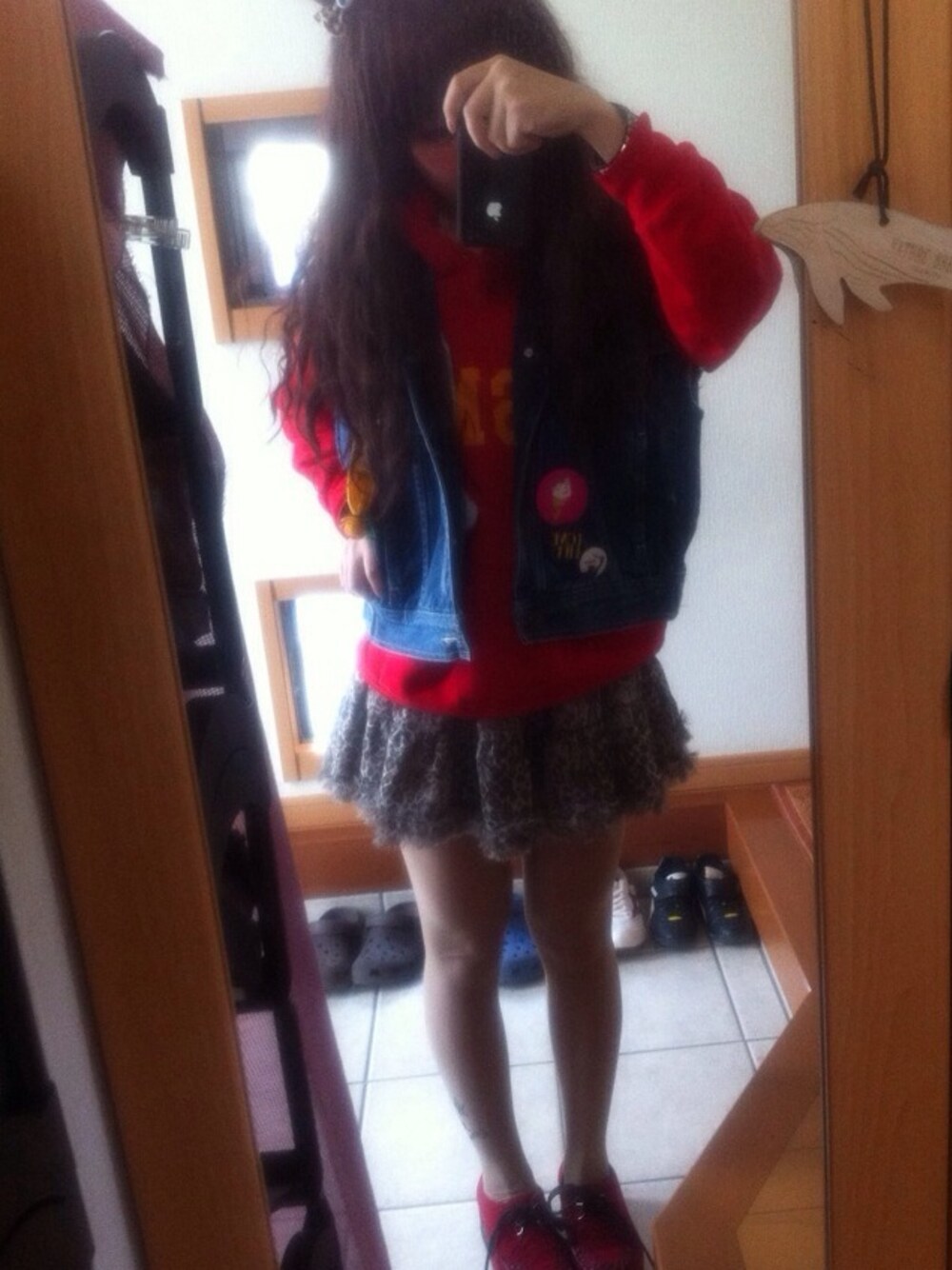 レッド系のパーカーを着用したレディースの春コーディネートの1枚目の写真