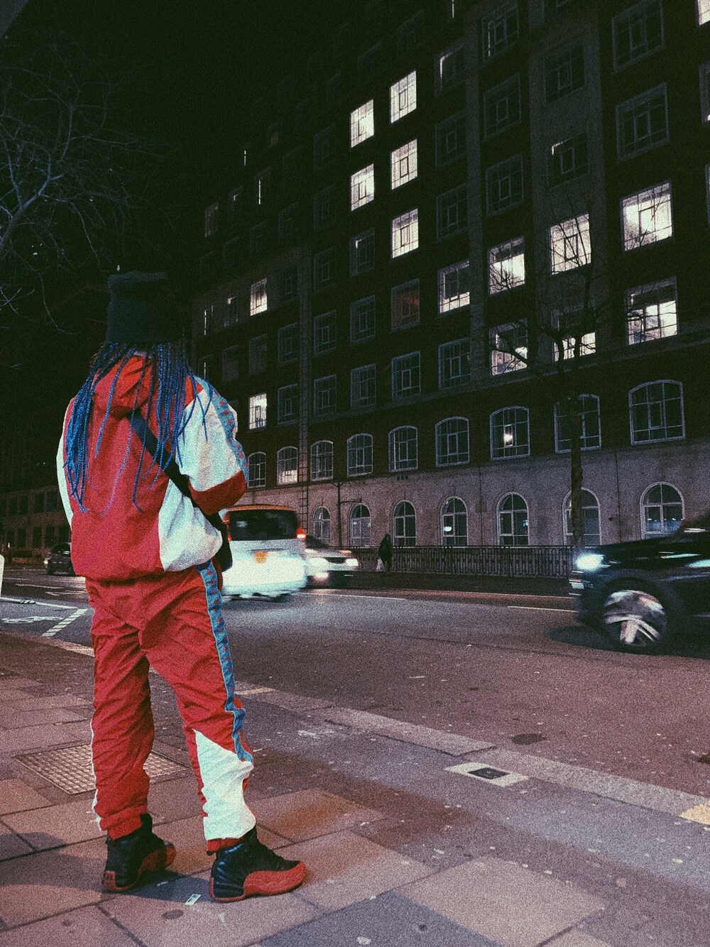 レッド系のジャージ、ブラック系のスニーカーを着用したレディースの冬コーディネートの1枚目の写真