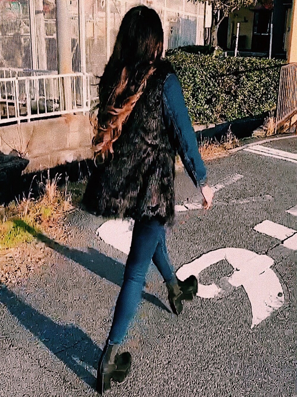 ブルー系のデニムパンツ、ブラック系のシューズを着用したレディースの春コーディネートの1枚目の写真