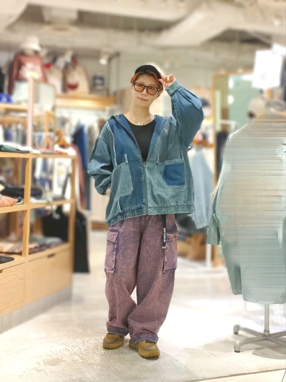 デニムパーカー着回しコーデ! ボーイッシュにまとめてみましたよ💙 上がデニムなので下はオーバーダイパンツ(紫)で合わせてみました〜◎ デニムパーカーは軽くて裏地がないので早い時期から活躍しそうです🏃 カーゴパンツ、あんまり履いてなかったシルエットなのですが可愛い〜! 意外と太すぎなくて履きやすいデザインでした✨