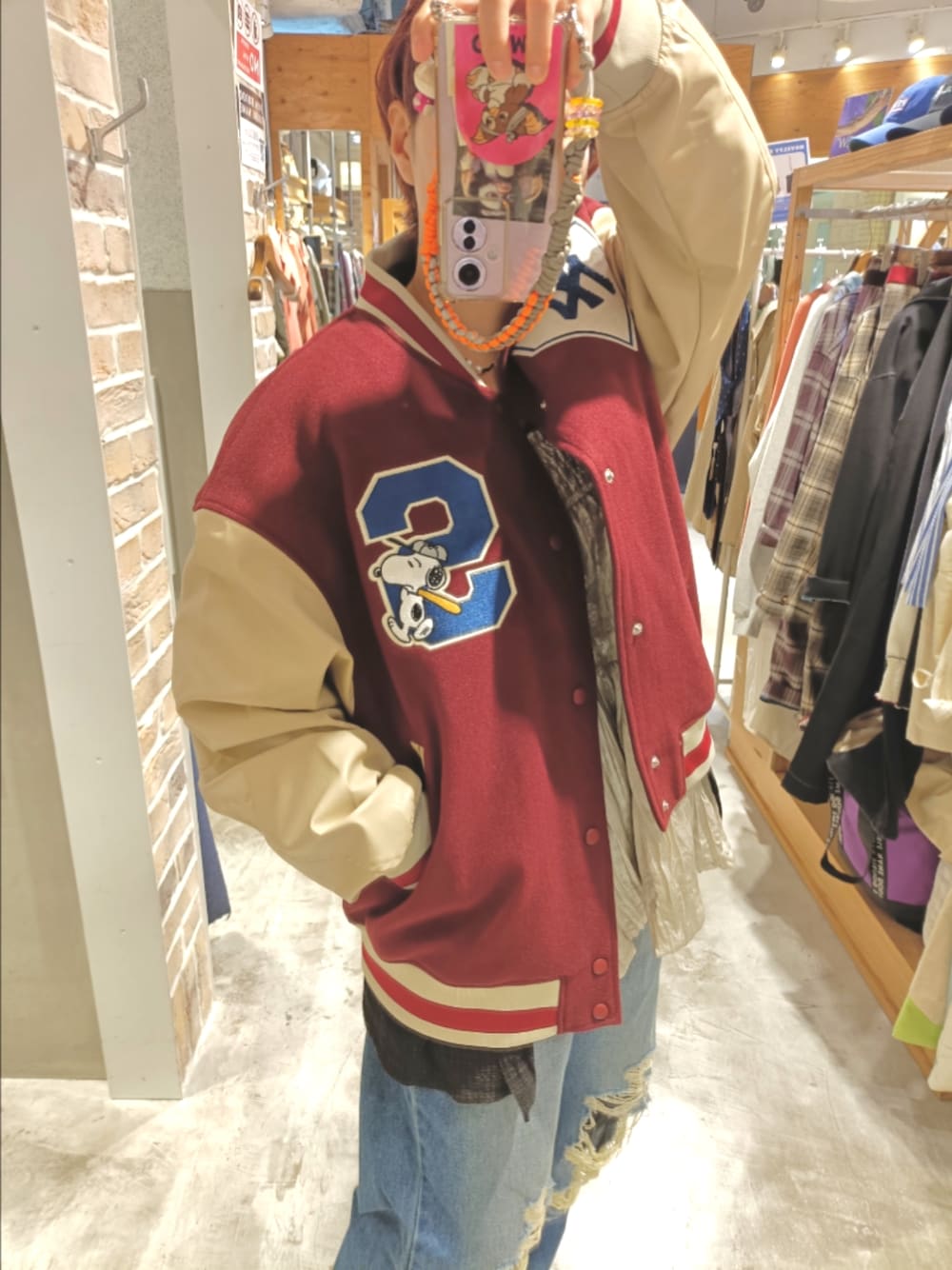 kuu(DOUBLENAME 新宿店)のスタジャン「MLB×PEANUTSコラボスタジアムジャンパー」を使ったコーディネート