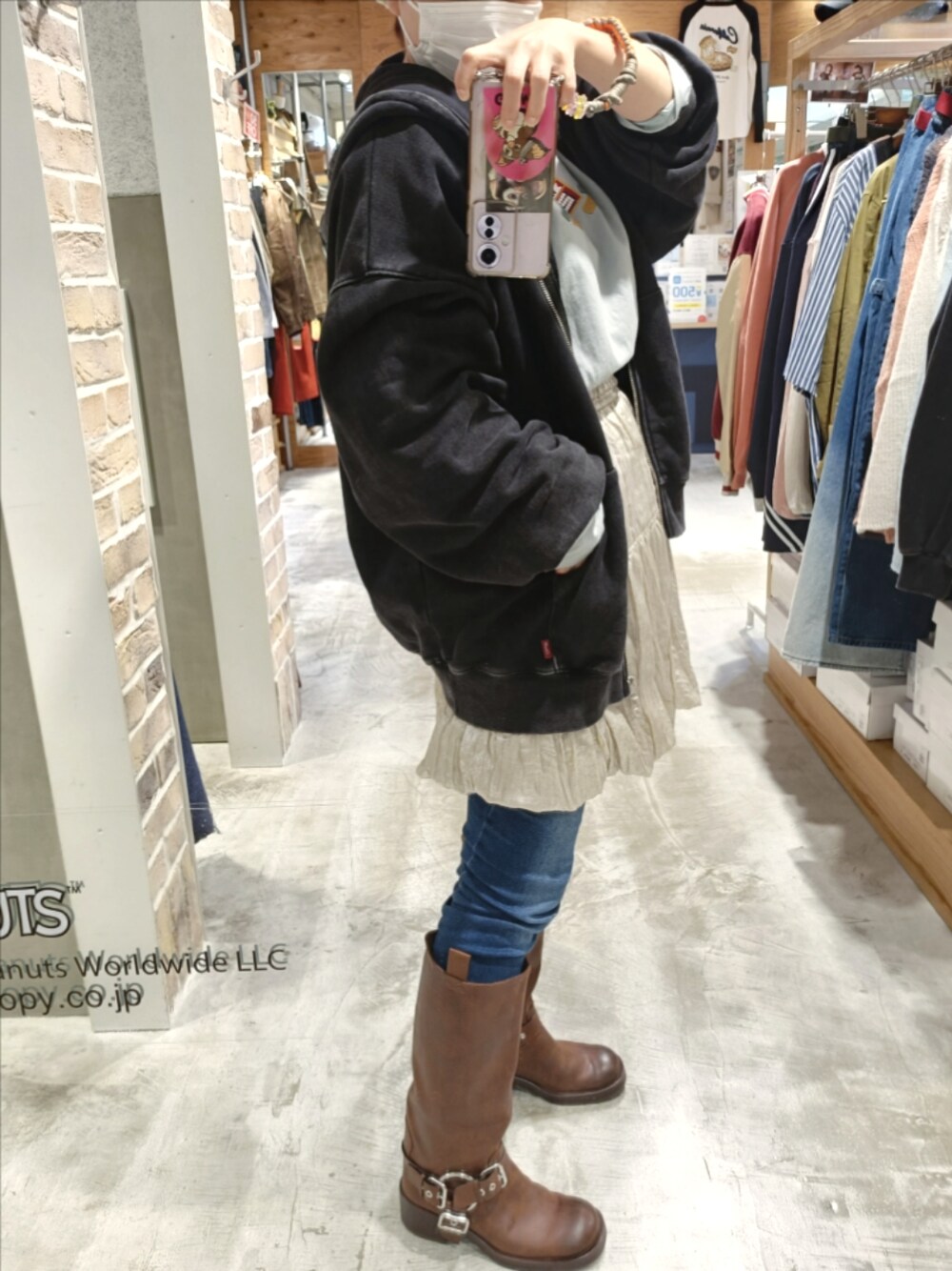 いつものデニムとパーカースタイルにスカートをプラス! カジュアルに甘めがプラスされ垢抜け印象に✨ ダブルネーム定番のスリムサルエルパンツはロングブーツとも相性バツグンです💕