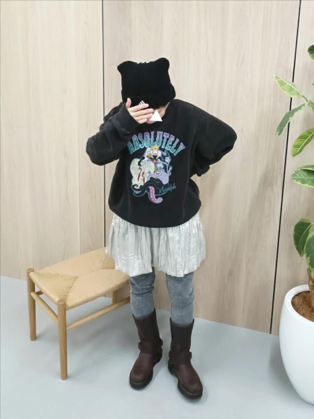 villainsのスウェットは厚手で冬にぴったり✨ 加工感が古着っぽさを醸し出してくれます☺️ パンツだけだと物足りないのでスカートレイヤードで暖かさと可愛さをプラス💕 ブーツで防寒もばっちりです✊🏻