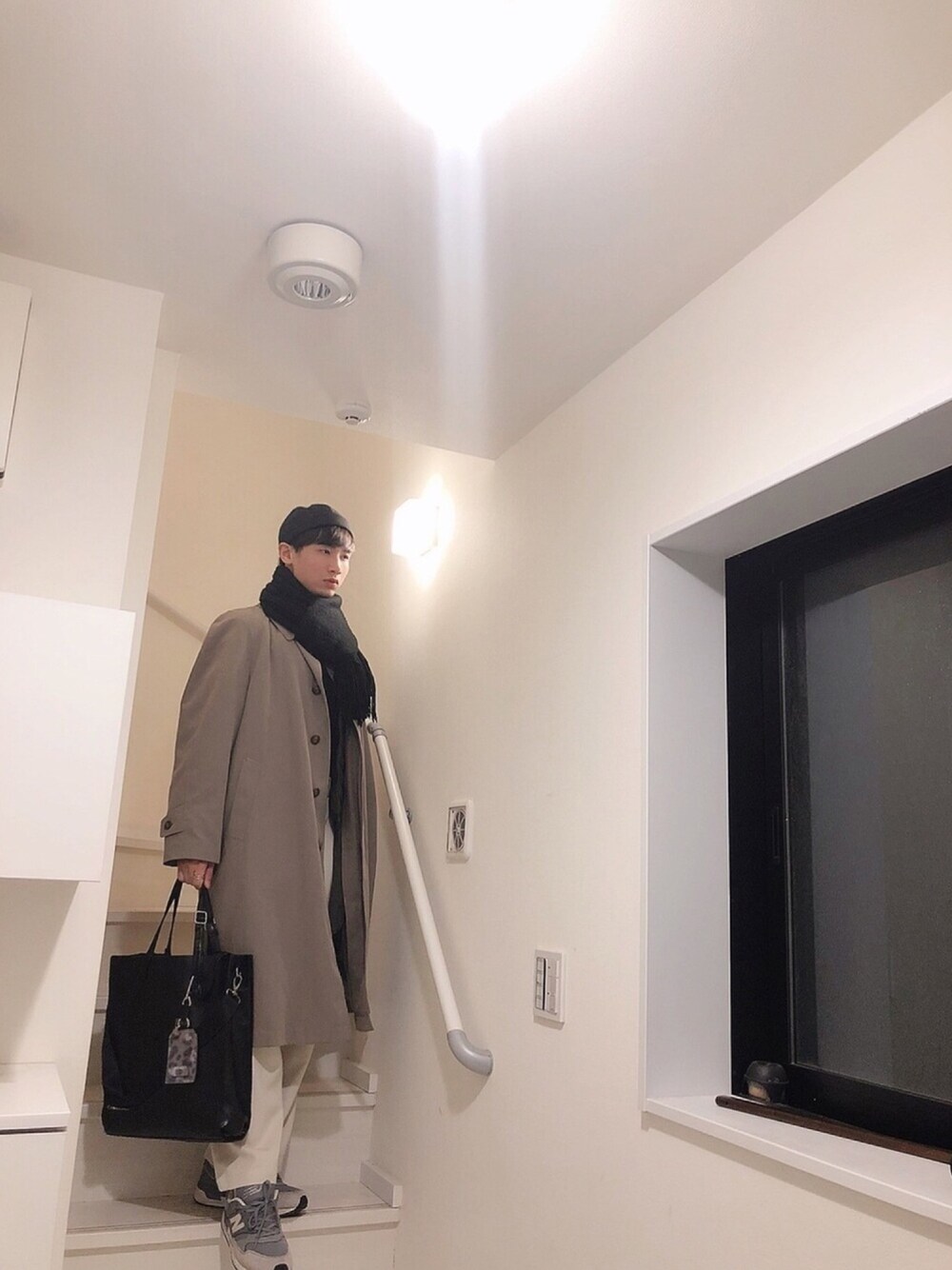 おはよう御座います☀️ 今日のコーデです 古着のロングコート 白いワイドパンツ グレーのNew Balanceスニーカー 後は黒いアクセサリー いいね、save、フォローをよろしくお願いします🤲