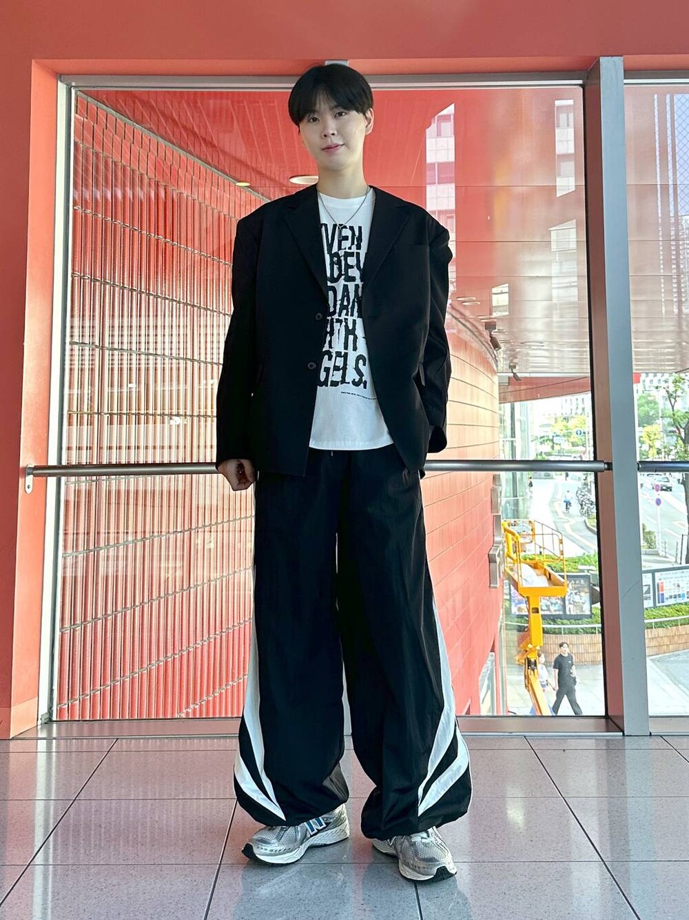 サイズ感が大きめのジャケットでキレイめに見えすぎないので、普段ジャケット着ない方でも着てもらいやすいです🚀✨ ジャケットにスポーティなしゃかしゃか素材のアイテムを合わせるアンバランスさも可愛いポイント🎶