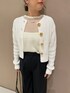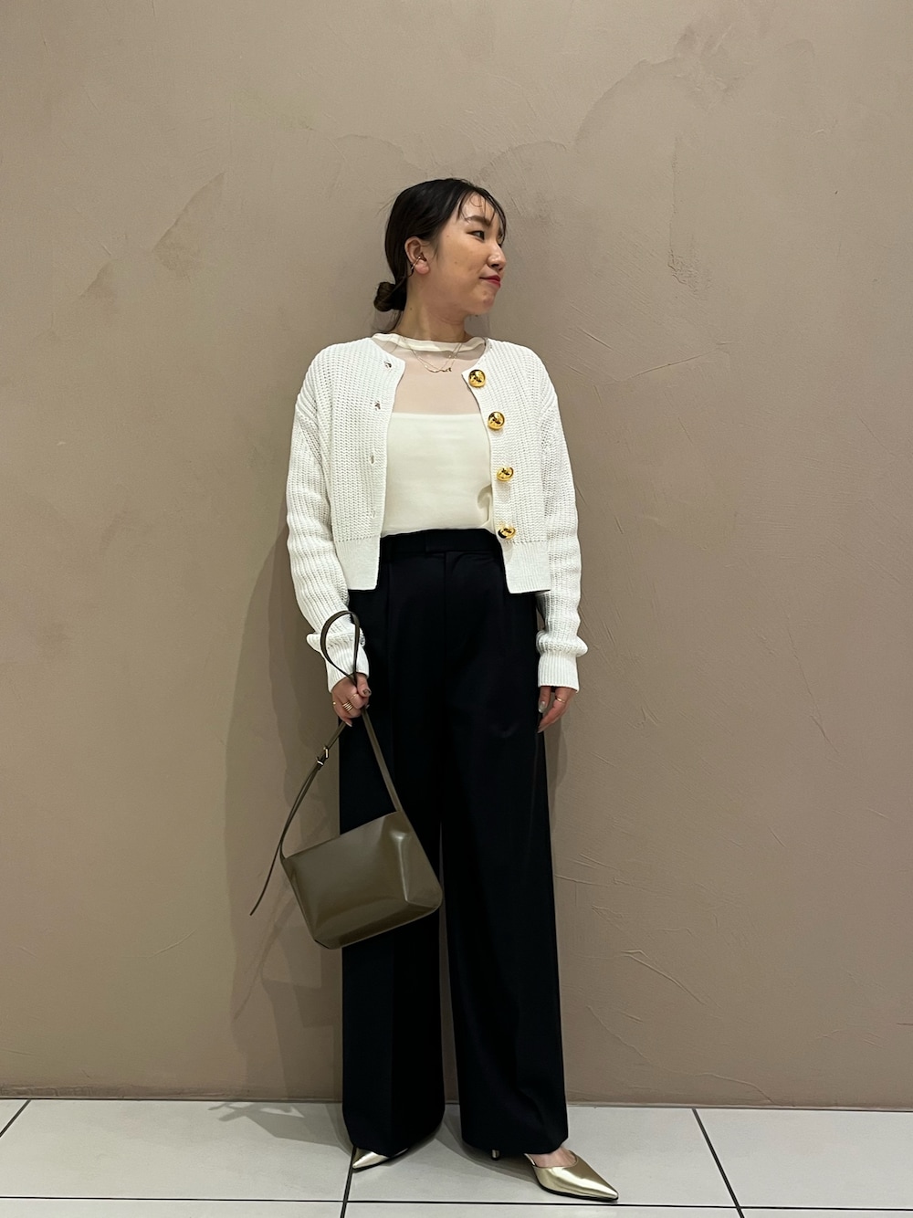 金ボタンカーディガンが程よくインパクトがあるのでパンツのインナーはシンプルに。 ボタンを閉めてトップスとしてきても可愛いです!