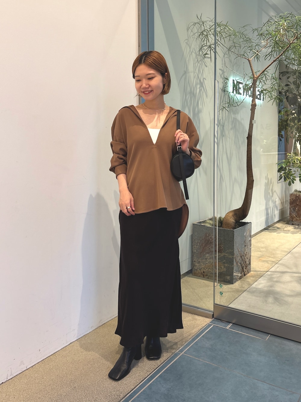 トレンドのブラウンコーデ。 ゆったりとしたシャツにスッキリとしたスカートを合わせた メリハリのある細見えバランス。 【スカート】36サイズ着用。 とにかく細見えするスカートです! バイアス生地なので窮屈感はなく 自転車も乗れるくらい伸びます。 ヒップや腰周りはフィットするデザインなので 個人的にはトップスを上から被せるスタイルが シルエットにメリハリが出ておすすめです。