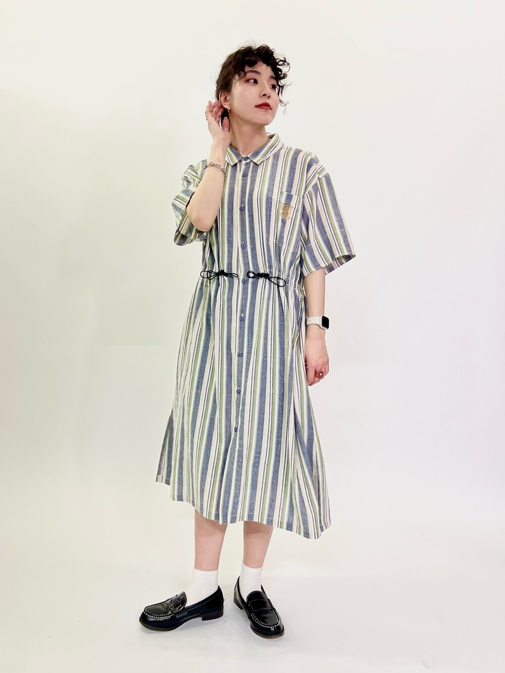 ゆーみん(DOUBLENAME 新宿店)のシャツワンピース「ストライプウエストドロスト半袖シャツワンピース」を使ったコーディネート