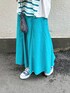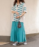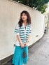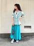 爽やかブルーカラーコーデ! ミニ恐竜ワッペンが可愛いラガーTEEはユニセックスで着用可能です◎ フレアスカートは綿麻素材でさらっと涼しく着られますよ♪