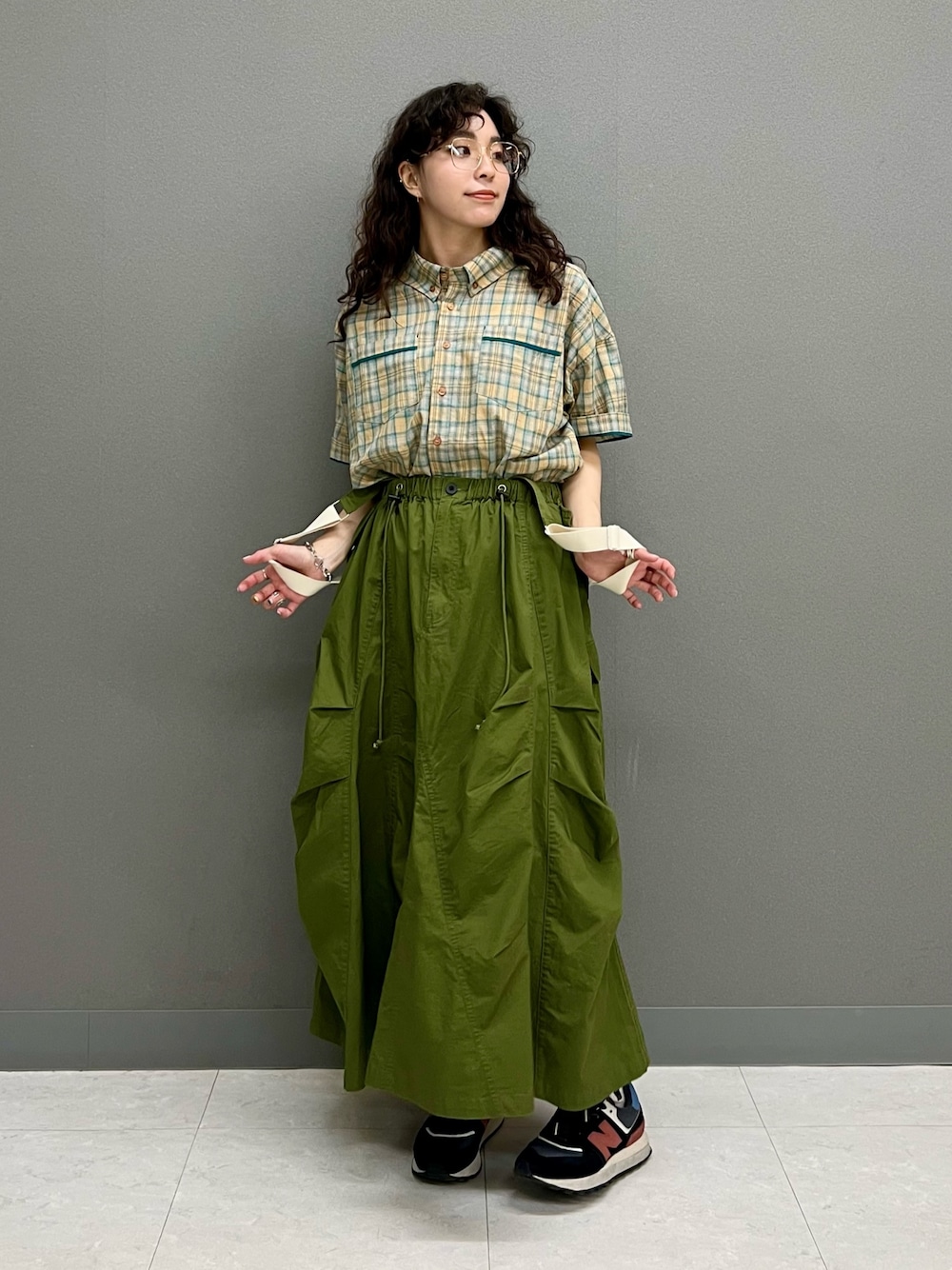 チェックシャツにミリタリー風なスカートを合わせたレトロコーデ! スカートのサスペンダーは取り外し可能です◎