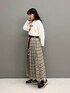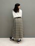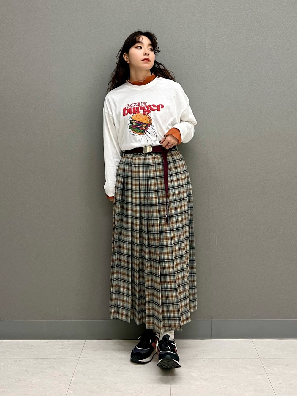 プリントTシャツにチェック柄スカートを合わせた秋コーデ! ぷっくりとしたハンバーガープリントが魅力的♪ プリントと同系色のインナーを合わせればお洒落見え間違いなし! スカートはワイドプリーツデザインで揺れ感がとても可愛いですよ◎
