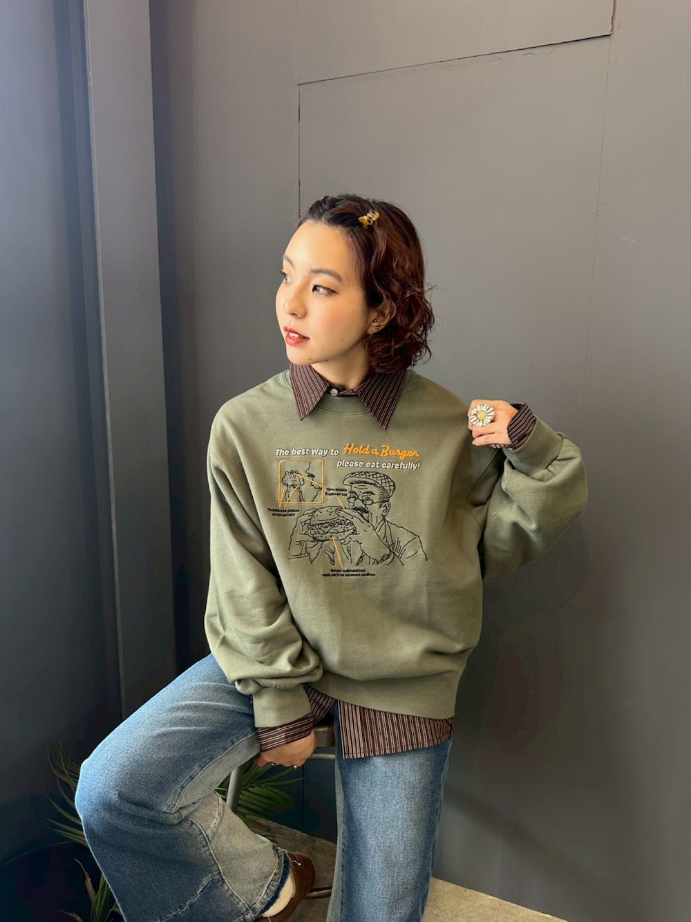ゆーみん(DOUBLENAME 新宿店)のスウェット「grandpa burger刺しゅうプルオーバー」を使ったコーディネート