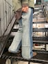 おじいちゃんがハンバーガーのベストな持ち方を教えてくれてるユニークな刺繍デザイン!🍔 配色が可愛いデニムフレアパンツは美脚効果抜群です❣️