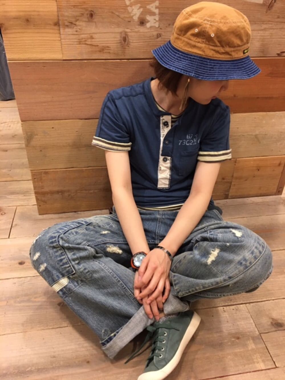 今日は大好きなブルーコーデでした☆ インナーに、ボーダー柄のメンズTシャツを重ね着し、アクセントに☆ 帽子やインナー、時計などの小物は同系色で合わせました♪