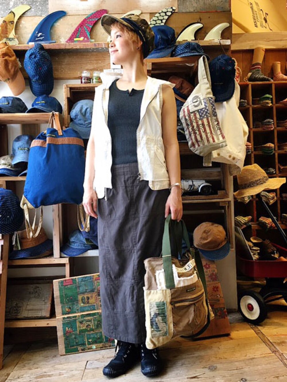 今日はノースリーブでも、色合いやミリタリーテイストで秋を意識してみました☆ ベストはとても万能で、ボーイッシュにも大人カジュアルにも使えます!☆ コンバースのスニーカーは、ブーツっぽいデザインとなっており、これからの季節に大活躍間違いなしです!